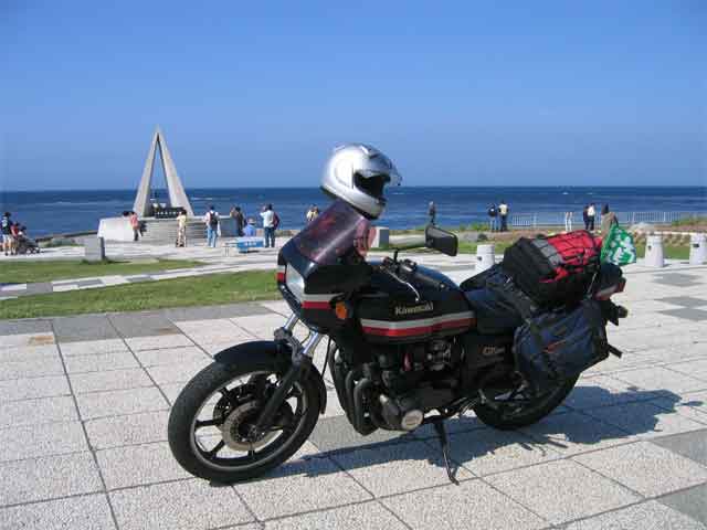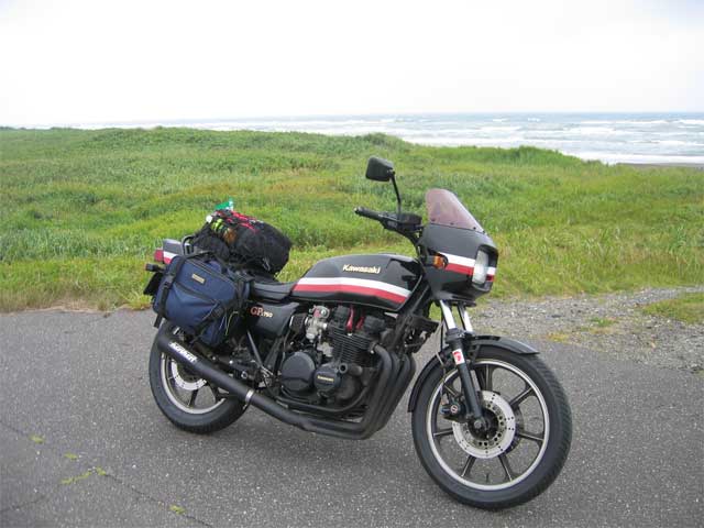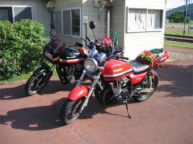駅長室跡に宿泊を決めてのんびりしていると、もう一台バイクが・・・なんと珍しいZ750GPではありませんか。
