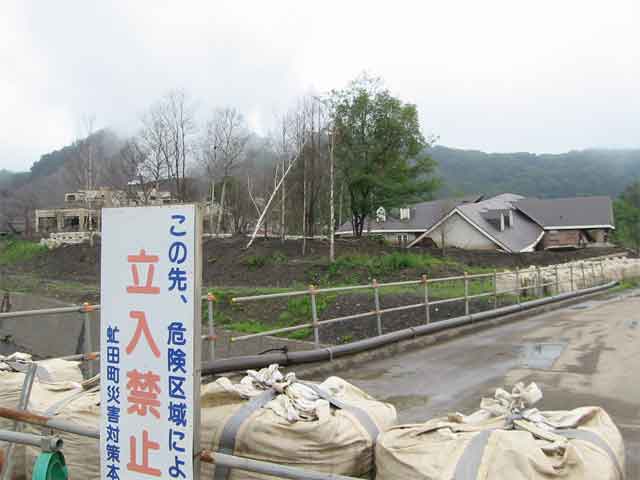 | 有珠山・虻田地区。噴火して泥流に飲み込まれ廃墟となった集落。 噴火口が見学できると聞いてGPで行こうとしたら、突然転倒。どうやら泥流ですべったようだ。すべったのはいいが、起こそうにもすべって起こせなかったな。辺りは廃墟で誰もいないし、カッパは泥汚れになるは全然良い事がない。この後、公衆トイレで泥だらけのカッパを洗いました。 GPのライトステーは折れ曲がるし、肋骨にはヒビが入るし、最悪。 |